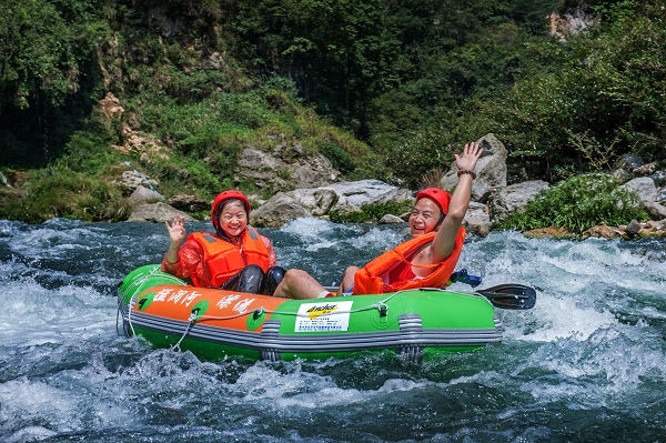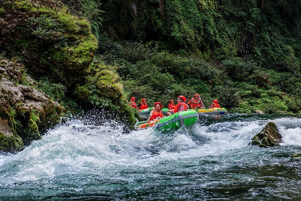 猛洞河漂流,起點哈妮宮距王村約40公里,行車1小時,終點牛路河距王村30分鐘的車程,漂流水路長17公里,漂流兩個半小時。從哈妮宮放舟而下,一路是古老的河道,絕壁百里,怪石嶙峋,灘奇水異,兩岸蒼翠的林木,云霧繚繞,飛瀑流泉與溶巖峰林交相輝映。拐一百五十五個彎,在一百三十三個灘潭中穿梭而行,迂回流連,馳魂奔魄,心曠神怡。