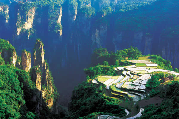 空中田園坐落在天子山莊右側(cè)經(jīng)老虎口、情人路方向兩公里處的土家寨旁,海拔1000余米。它的下面是萬丈深淵的幽 谷,幽谷上有高達數(shù)百米的懸崖峭壁,峭壁上端是一塊有3公頃大的斜坡梯形良田。田園三方峰巒疊翠,林木參天,白云繚繞,活像一幅氣勢磅礴的山水畫。登上“空中田園”。清風拂袖,云霧裹身,如臨仙境,使人有青峰鳴翠鳥,高山響流泉,身在田園里,如上彩云間”之感。