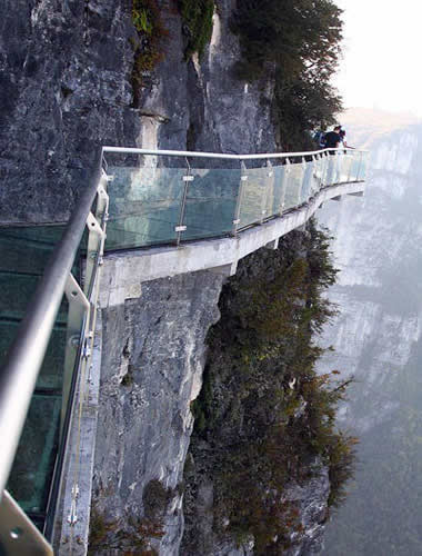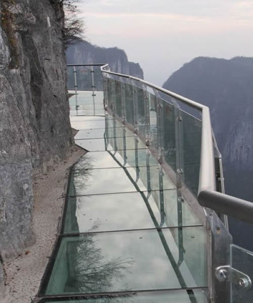 2011年10月1日,張家界天門山國家森林公園新建的玻璃棧道正式對游客開放。玻璃棧道懸于天門山頂西線,長60米,最高處海拔1430米。是張家界天門山景區(qū)繼懸于峭壁之上的鬼谷棧道、憑空伸出的玻璃眺望臺、從玻璃臺可以看見下面。玻璃臺伸出棧道有4-5米,專供游人拍照、橫跨峽谷的木質(zhì)吊橋后打造的又一試膽力作。為了讓游客零瑕疵的透過玻璃橋看到美麗的風景,上橋的游客均要求戴上鞋套,以保持玻璃橋的透明和干凈。玻璃棧道的刺激震撼,可與舉世聞名的美國大峽谷玻璃走廊“天空之路”媲美,因而有了東方“天空之路”的美譽。