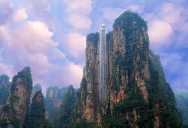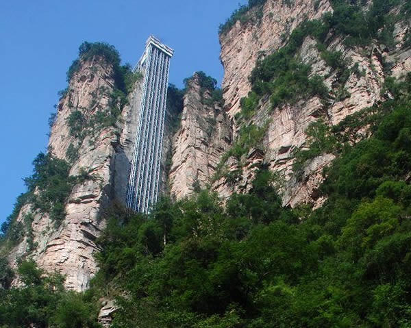 百龍?zhí)焯菀挥谑澜缱匀贿z產(chǎn)張家界武陵源風景名勝區(qū),1999年9月動工,2002年4月投入營運,電梯的主要設備由德國知名電梯公司研究生產(chǎn),耗資人民幣1.8億元,被譽為“世界上最高、運行速度最快、載重量最大的電梯”,也因此被載入吉尼斯世界紀錄。