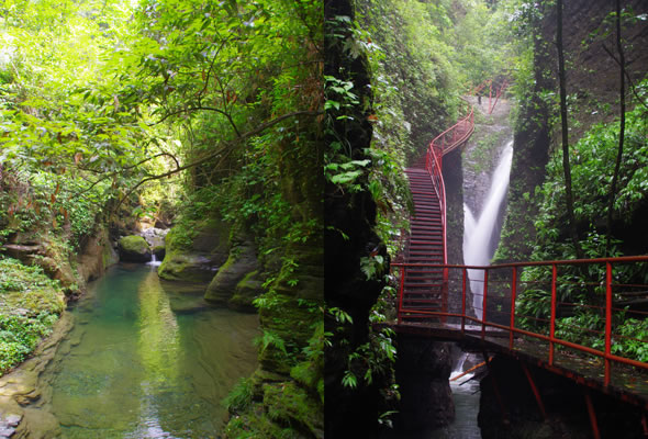 十八潭總名。稍作休憩,我們開(kāi)始奔赴東線的景點(diǎn)。東線主要是以十八潭為主,下游有4潭:合潭、梳妝潭、魚(yú)潭、黑潭;中游有9潭:換衣潭、美人潭、石蛙潭、姊妹潭(3個(gè))、情侶潭(2個(gè))、二龍搶珠,上游有5潭:鬼谷神功(2個(gè))、幽潭、落銀潭(彩虹潭)、路邊潭。十八個(gè)潭深淺不一,淺則1米以上,深則4米左右,形狀各異,有的月牙形,有的豬腰狀,形狀不規(guī)則,石壁上水沖成潭,真是鬼谷神功,此處水質(zhì)細(xì)膩,加之綠林映襯,水色碧綠見(jiàn)底,猶如十八顆翡翠石鑲嵌在山林之間,涓涓溪流晶瑩剔透,飛流直下的瀑布,氣勢(shì)磅礴,蔚為壯觀, 下游的4潭,合潭、梳妝潭、魚(yú)潭、黑潭。合潭是仙女峽谷與十八潭的交匯處;梳妝潭的水清如明鏡,又因?yàn)樘秲蓚?cè)石頭的封閉,使這面鏡子靜止不動(dòng),很方便梳妝,照鏡子。在梳妝潭周?chē),有一種植物屬于紅豆杉系列,它的形狀好似梳子,可以用來(lái)梳頭。魚(yú)潭可不能望文生義。魚(yú)潭,是在冬天的時(shí)候,所有的魚(yú)都聚集在這里過(guò)冬,除此之外,這個(gè)潭水淺見(jiàn)底,冬天魚(yú)苗聚集,是捕魚(yú)的好季節(jié)。黑潭,水深不見(jiàn)底,所以叫黑潭,F(xiàn)在已經(jīng)看不見(jiàn)梳妝潭、魚(yú)潭、黑潭了,你猜為什么?建水庫(kù),建水上樂(lè)園,淹沒(méi)了。 斷魂石的傳說(shuō)。三國(guó)時(shí)期,高氏和蕭氏一對(duì)夫妻春節(jié)忙活,遇上了天門(mén)垮眼,受余震襲擊,打死了丈夫蕭氏。高氏思念丈夫,淚哭不斷,結(jié)果摔死潭中。人們經(jīng)常還能聽(tīng)到哭聲傳來(lái),不敢單獨(dú)行走,需成群結(jié)隊(duì)。后人為了鎮(zhèn)邪,雕刻一條蜈蚣驅(qū)趕哭魂,多年后,蜈蚣成精,天上打雷,巖石發(fā)光,遭雷所劈,成了斷魂石。 和尚姥,也就是丹灶峰,天門(mén)十六峰之一。相傳此峰為仙人化身,赤松子曾在此煉丹,許多詩(shī)人在此留下了美妙的詩(shī)篇,明代葉守禮《丹灶峰》: 懸崖峭壁隔塵寰,上有仙人學(xué)煉丹。 煉得丹成鶴已去,獨(dú)留丹灶在峰巒。 意思是說(shuō),在這險(xiǎn)峻秀麗的山峰上,赤松子潛心煉丹,不受塵世干擾,身心沉醉于秀美的山間,沉溺于丹藥的煉制之中。作者很是羨慕那種與世隔絕的超脫,那種執(zhí)著于自我理想的瀟灑,你羨慕不羨慕? 竹林叢生。我們要學(xué)習(xí)竹子的精神,中空、謙卑;我們要學(xué)習(xí)竹子的精神,抱團(tuán)生長(zhǎng);我們要學(xué)習(xí)竹子的精神,破土而出,節(jié)節(jié)高。 向家塔。打造農(nóng)耕養(yǎng)生游的地方。種田、種菜、種花,農(nóng)家餐館。 爛泥巴根。爛泥巴根和馬桑樹(shù)是同科,是這里獨(dú)特的一種樹(shù)。馬桑樹(shù)亦稱(chēng)“千年紅”、“馬鞍子”,屬落葉灌木,馬桑樹(shù)多枝叢生,一簇一簇的,枝葉像傘蓋,因此“馬桑樹(shù)兒搭燈臺(tái)”。春風(fēng)一吹,滿山的馬桑樹(shù)、爛泥巴根就吐翠滴綠,顯示出強(qiáng)勁的生命力。打油詩(shī)一首: 青青枝條四方走, 肥肥大葉落上頭, 身在路邊無(wú)人問(wèn), 冬去春來(lái)樂(lè)悠悠。 秋天死亡,春天長(zhǎng)勢(shì)更加茂盛,它的新生是通過(guò)死亡實(shí)現(xiàn)的。山川如此,植物也是如此,這里的一草一木無(wú)不透露著道家那種齊生死、等貴賤的精神。 這叫“常道”亭,“道可道,非常道”,據(jù)說(shuō)是白狐與劉海相遇的地方。吊橋。 十八潭各具特色。 中游有9潭。第五潭叫換衣潭。巖石聳立,霧氣氤氳,巖壁上布滿水汽,猶如雨下。又因過(guò)道狹窄,行人需彎腰通過(guò),未免雨水打濕衣裳,在此就要脫下身上衣物,通過(guò)后在第六潭再穿上。因此第六潭又叫美人潭,很幽深神秘的。第七潭叫石蛙潭,水淺,又比較平穩(wěn)、安全,春天產(chǎn)籽。余音回響,猶如蛙鳴,給人“聽(tīng)取蛙聲一片”的錯(cuò)覺(jué)。 對(duì)面巖壁叫“臘肉鋪”,那條自上而下的溪流叫“酒長(zhǎng)流”,客人來(lái)了,咱土家人熱情,臘肉下炕,苞谷燒,喝兩口! 第八潭第九潭叫情侶潭,比較隱蔽,他倆靜悄悄地談著情話,我們快走,不要打攪他們。 第十潭、十一潭、十二潭叫姊妹潭。下面那個(gè),水淺淺的,溫溫的,是幺妹潭,中間那個(gè)是二哥潭,上面那個(gè)是大哥潭。 潭的旁邊有珍稀植物馬蘭花,馬蘭花又名蝴蝶花、蝴蝶蘭,為多年生宿根草本花卉,根莖短粗,肥壯。花大新奇,花色絢麗,鮮艷奪目。花有藍(lán)、白、黃、雪青等色;ㄆ5-6個(gè)月,每次花可開(kāi)花7-10天,頗耐觀賞。馬蘭花在我國(guó)栽培已有2000多年的歷史,目前歐、亞、非3洲均有分布,品種極多,難以計(jì)數(shù)。此花按植株高度不同可分3種類(lèi)型:矮株型僅18-25厘米,中株型高25-70厘米,高株型可高達(dá)120厘米。馬蘭花喜陽(yáng)光,適栽于背風(fēng)向砂質(zhì)土壤中。 馬蘭開(kāi)花的童謠。他們?nèi)⒚眯r(shí)候情感深厚,常常一起跳皮筋。大家會(huì)跳嗎?會(huì)唱嗎? 小汽車(chē),滴滴滴,馬蘭開(kāi)花二十一, 二五六二五七,二八二九三十一, 三五六三五七,三八三九四十一, 四五六四五七,四八四九五十一, 五五六五五七,五八五九六十一 。…… 還有紅豆杉,像梳頭的篦子,叫“篦子三尖杉”。還有蘭心草,中草藥,空中飄來(lái)蘭花的香氣,山谷中峭壁的蘭花,如芳芳人品善良高雅。蘭花如人品有宜人的香氣,蘭花有撩人的幽香,任何花卉的香氣都不能與蘭花比。這幽香時(shí)