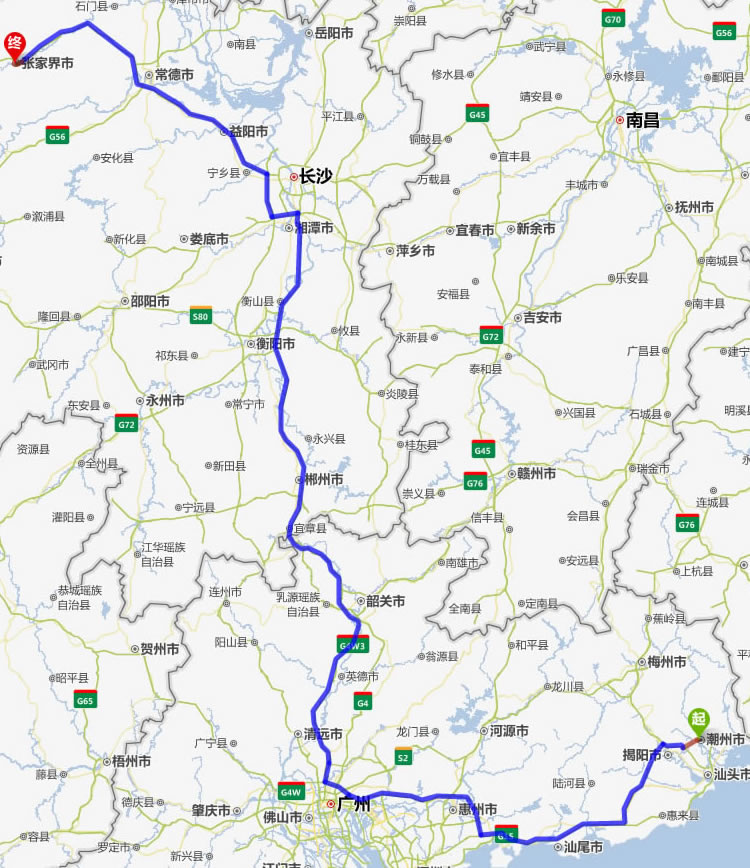 現(xiàn)在位置:張家界旅行社->交通指南->自駕車路線 -> 潮州到張家界旅游自駕車線路,潮州去張家界自己開車要多長時間,有多少公里