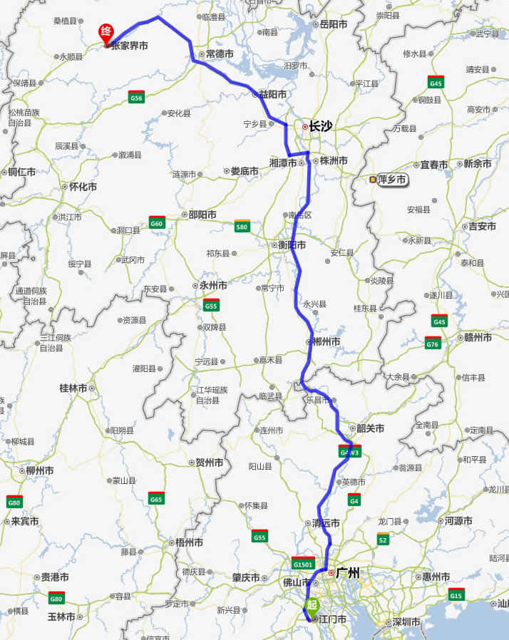 江門去張家界自駕車自助游線路圖全程高速):