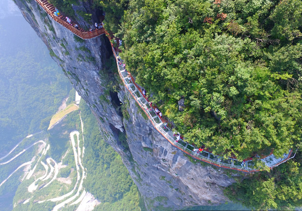 因站在玻璃棧道上能俯瞰天門山99道彎盤山公路而得名“盤龍崖玻璃棧道”