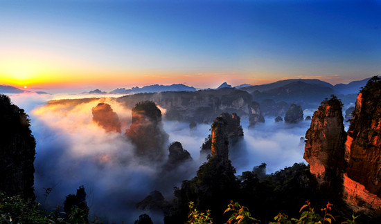 黃石寨是張家界核心景區(qū)武陵源的5條精品游覽線之一,傳說是張良、黃石公得道成仙的地方,是張家界美景最為集中的地方之一。黃石寨海拔1200多米,四周全是刀切絕壁,是俯視砂巖峰林景觀的最佳最大觀景臺,也是觀日出的最佳選地。