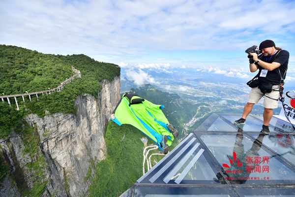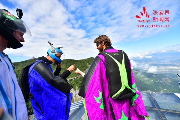 2017世界翼裝飛行世錦賽將于9月8日-10日在張家界天門山舉辦。開賽在即,9月7日上午,來自全球11個國家的16名翼裝飛行員從海撥1458米的張家界天門山玉壺峰頂一躍而下,在奇峰險壑間進(jìn)行競速訓(xùn)練。